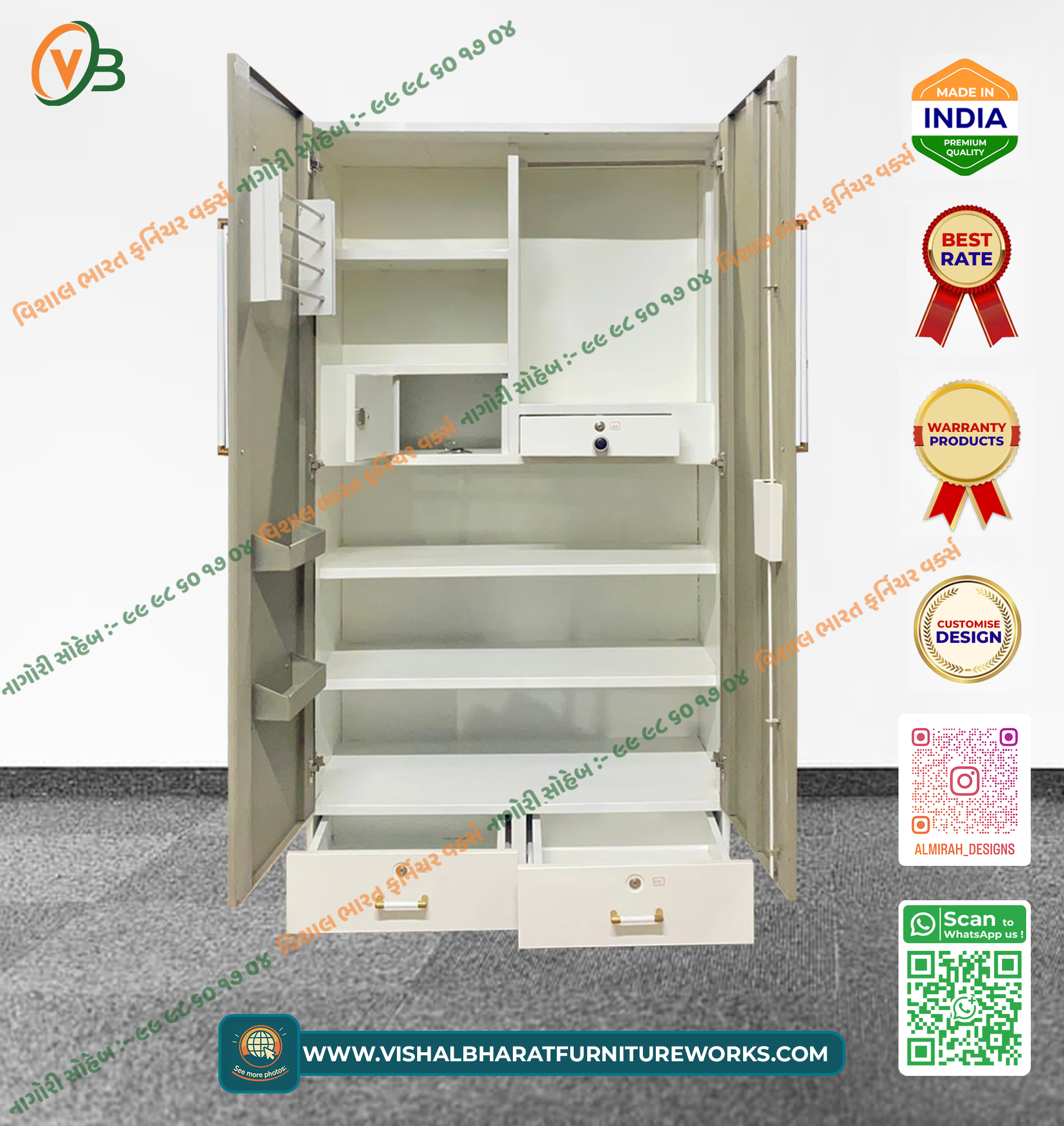 Illuminate your room with this Bright 2-Door Steel Almirah in a clean Beige finish. It boasts an exceptionally organized interior with a full-height mirror, door-mounted utility pockets, a high-security internal safe box, and spacious lockable base drawers. Durable, modern, and built with termite-proof steel.