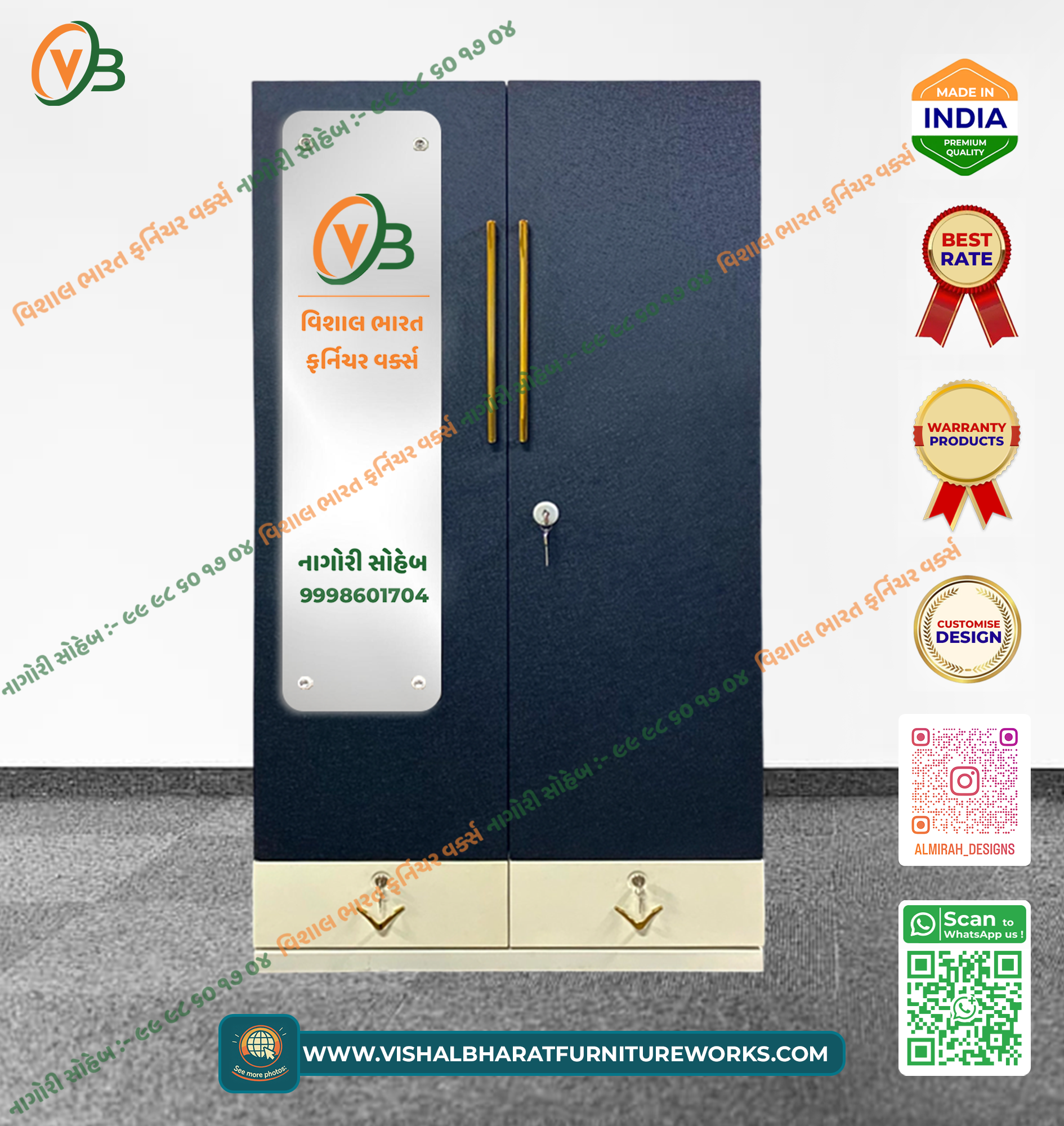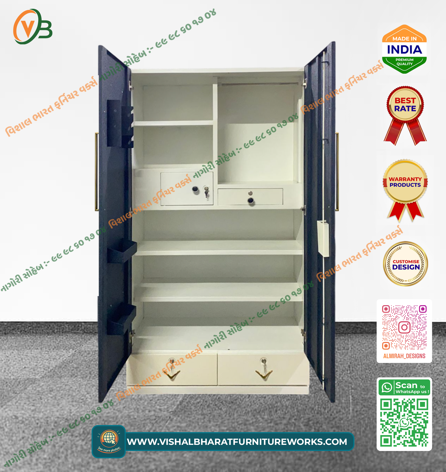 Achieve a striking look with this Contrast 2-Door Steel Almirah featuring a rich Dark Blue body and a clean, White base with lockable drawers. Its sturdy, termite-proof steel construction houses a spacious interior, complete with an integrated high-security safe and two internal drawers. Modern design meets reliable storage.