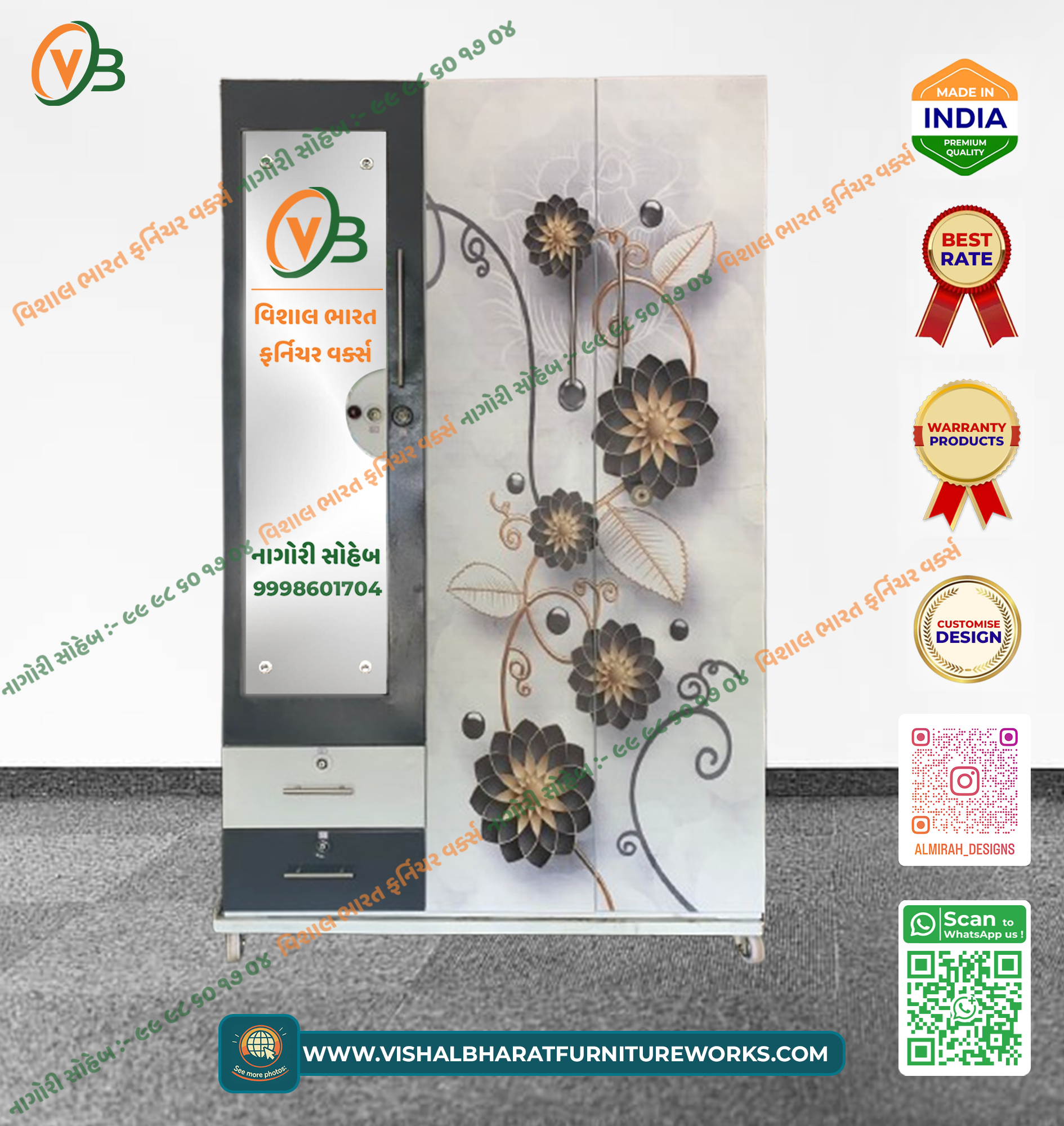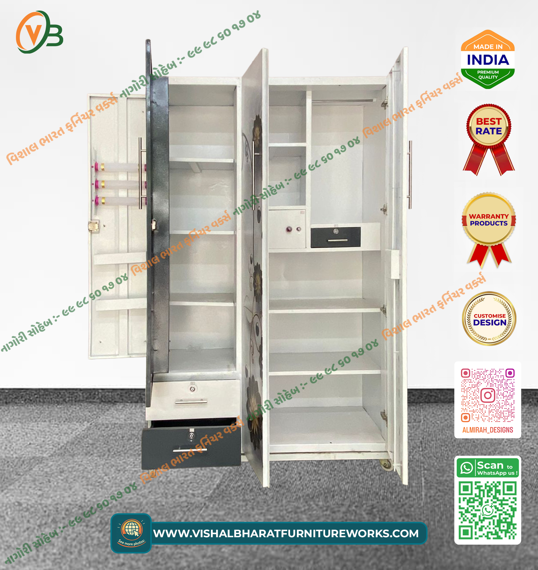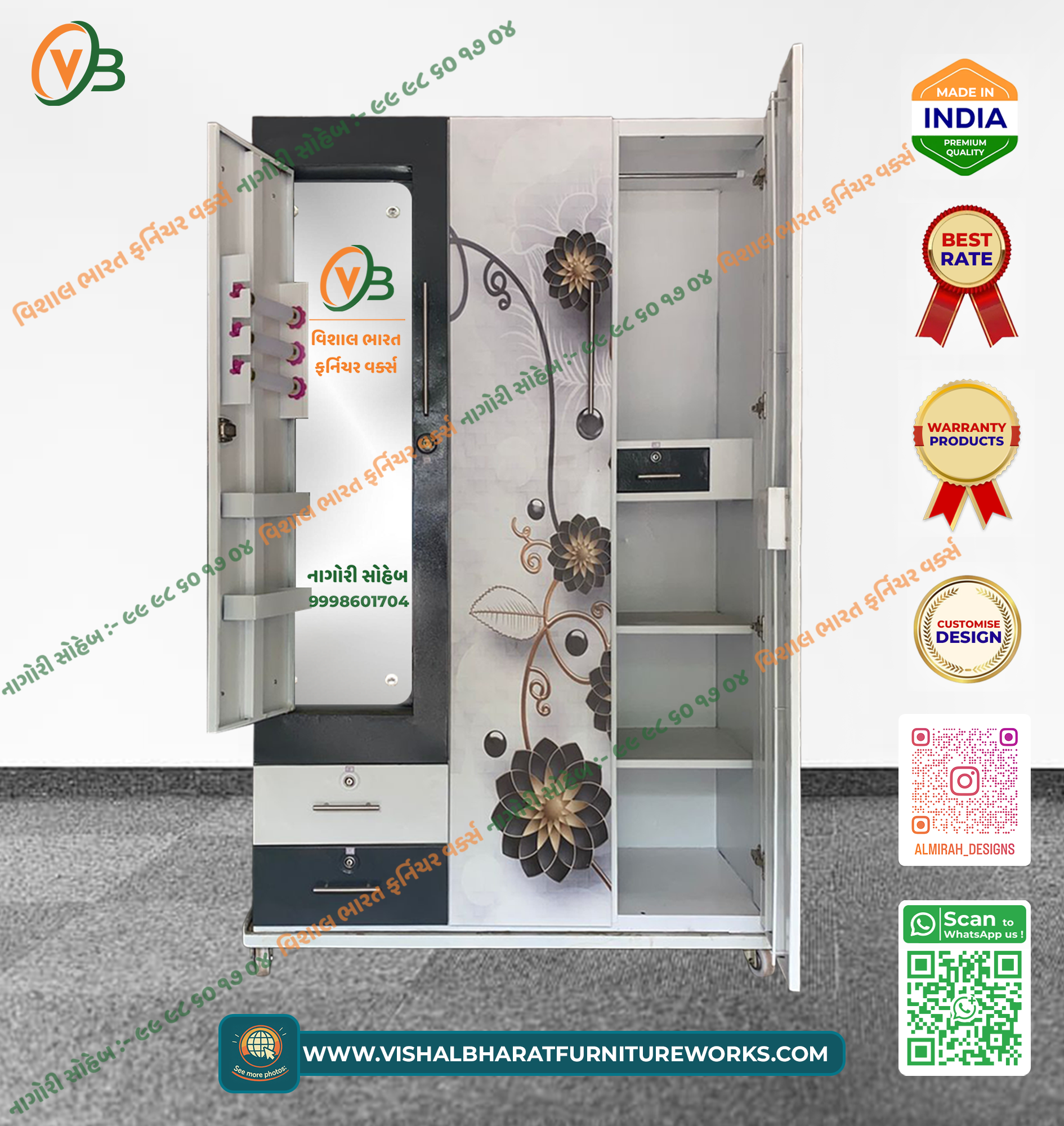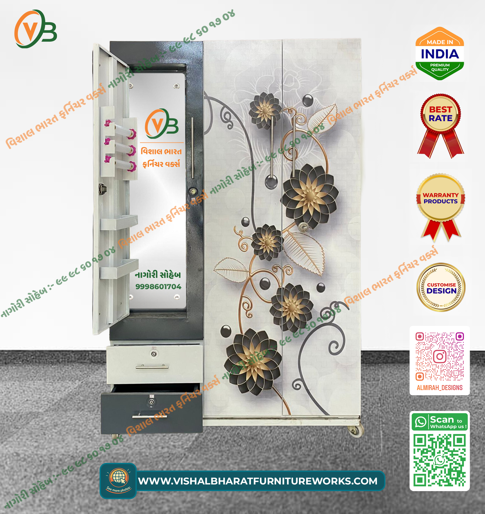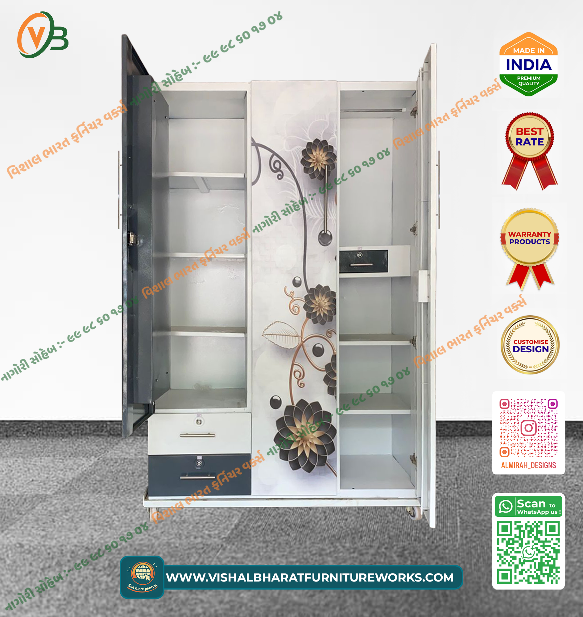 A spacious and elegant 3-Door Steel Almirah featuring a beautiful Floral Printed finish across the main doors. This designer wardrobe offers comprehensive storage, including a wide hanging section, multiple deep shelves, a large external mirror, and a secured internal safe. Termite-proof, durable, and perfect for large families.