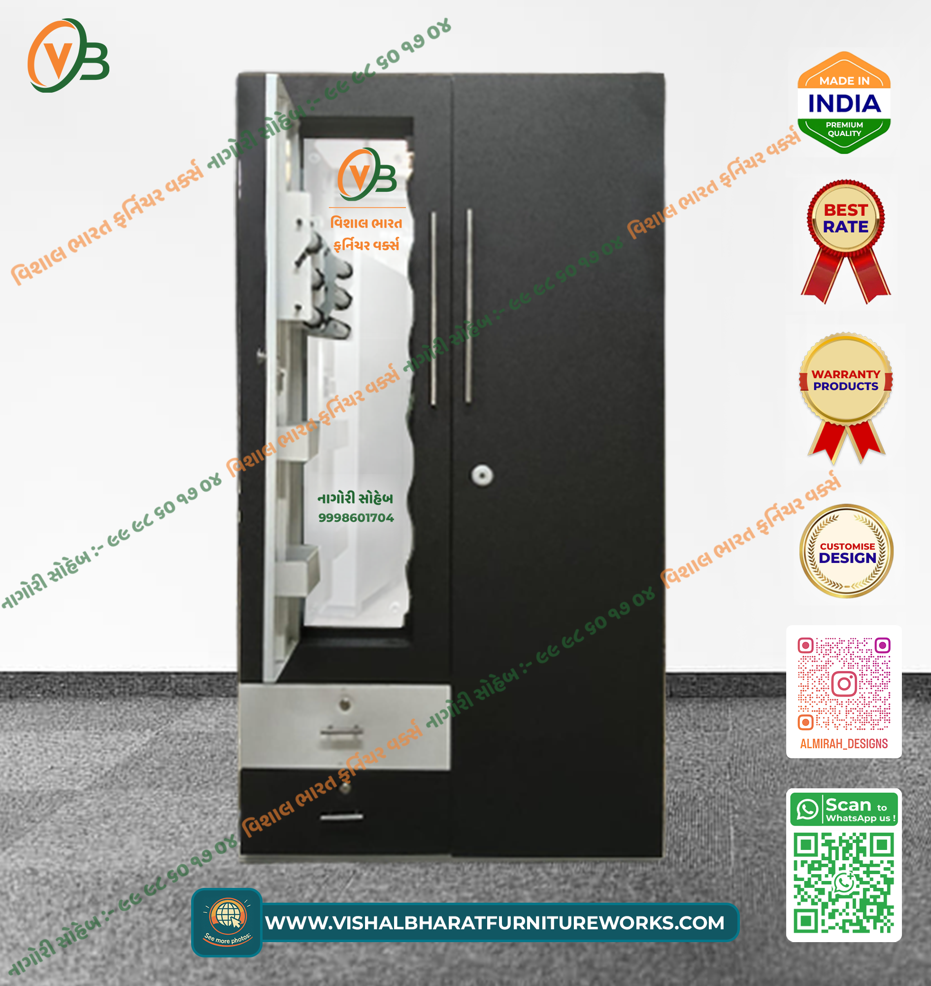 The ultimate storage solution. This massive 6-Door Steel Wardrobe in Dark Grey features three independent locking compartments, a central full-length mirror, and multiple secure drawers for valuables. Built from high-gauge steel for lifetime durability. Made in India.