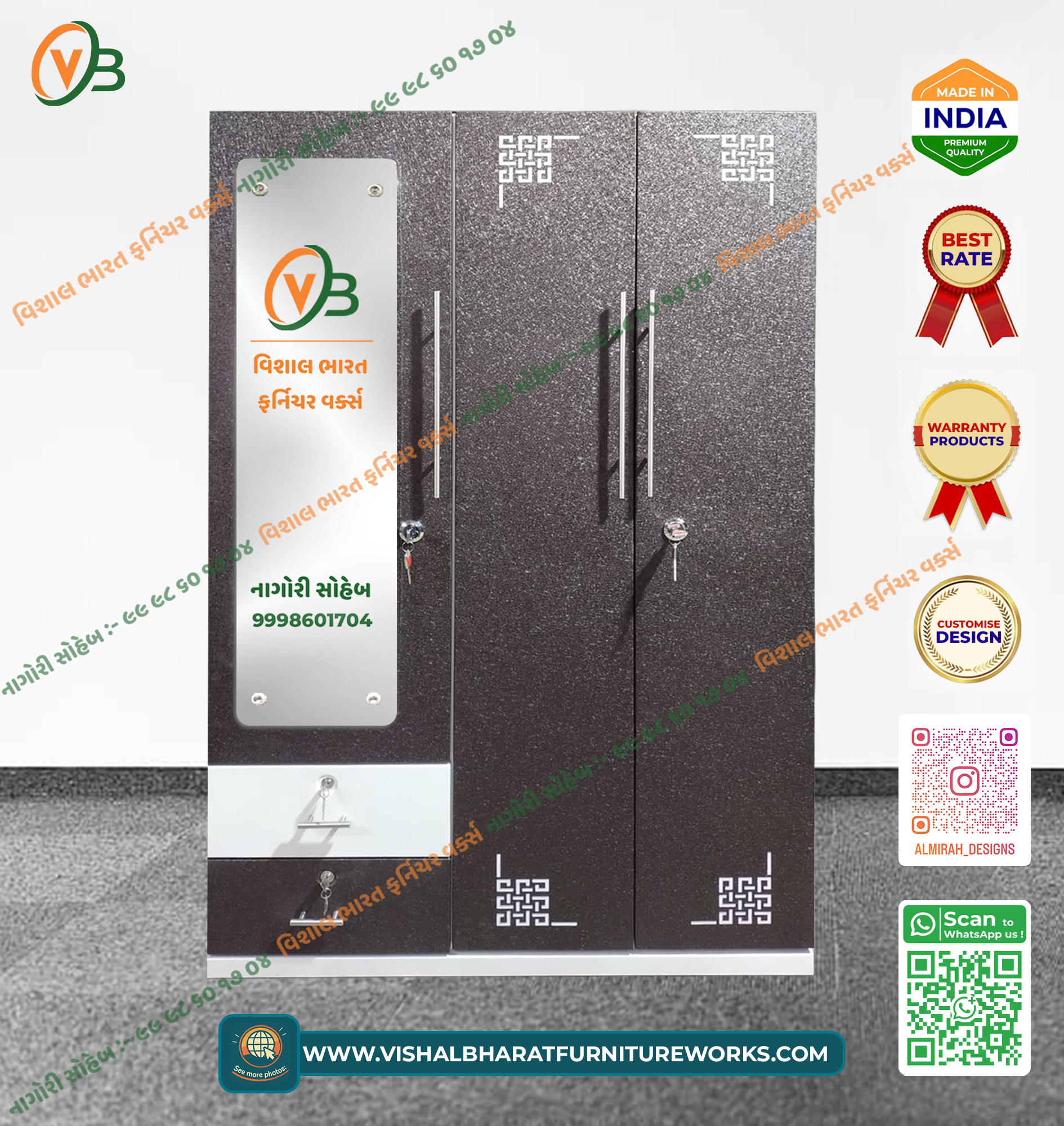 A premium, high-capacity 3-Door Steel Almirah featuring a rich Dark Brown Crocodile Skin Print. It offers extensive storage with a full hanging section, dedicated shelving, two external base drawers, and a high-security internal safe. Crafted from durable, termite-proof steel, this wardrobe provides both elegance and robust security for family use.