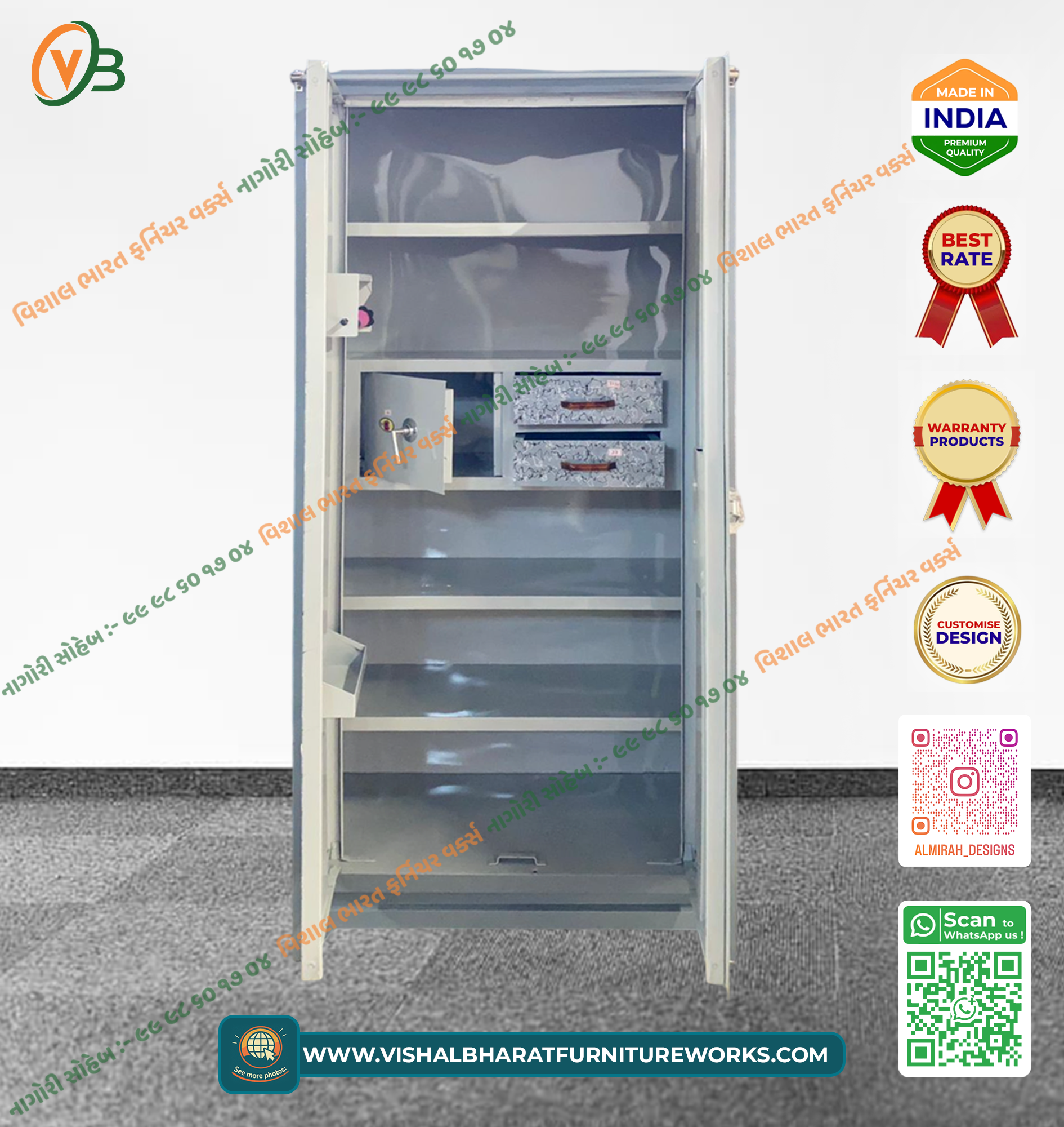 Short DescriptionA premium and secure storage solution in a stylish Textured Smoke Grey finish. This 2-Door Steel Almirah features a full-height internal compartment with ample shelving, an integrated high-security safe, and internal patterned drawers. Built with robust, termite-proof steel for lasting peace of mind.